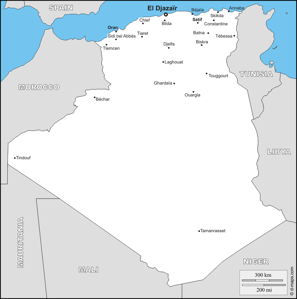 خريطة الجزائر صماء بحجم كبير وحدودها رسم واضح