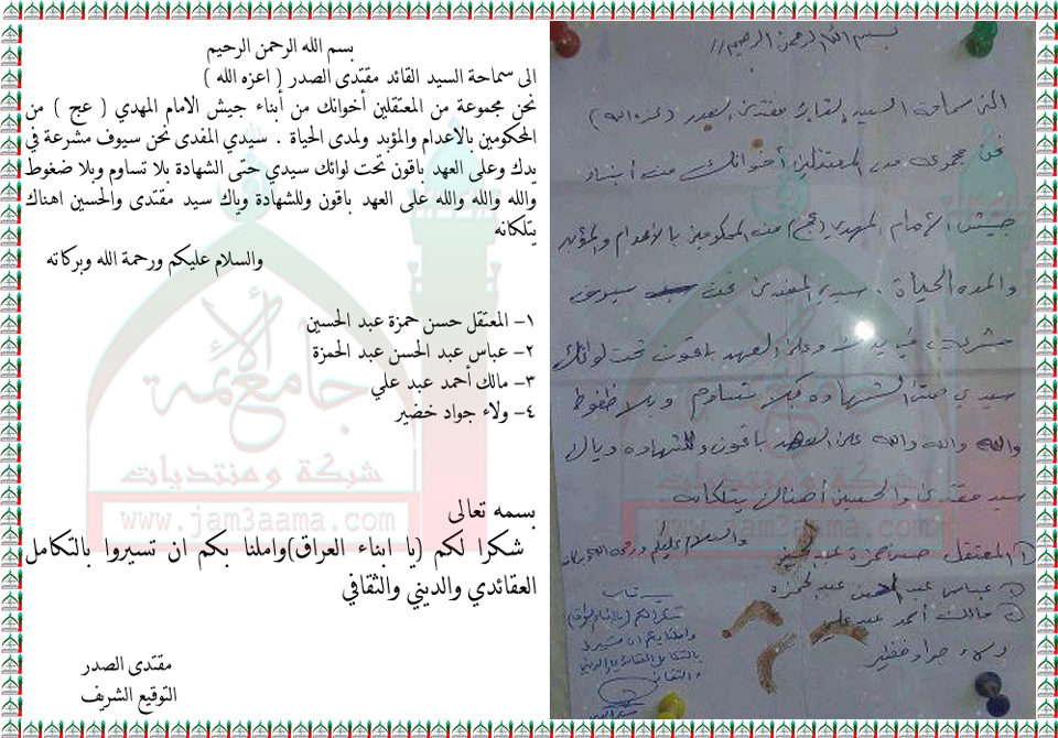رسالة المعتقلين من ابناء جيش الامام المهدي عج لسماحة السيد القائد مقتدى الصدر اعزه الله 8 4 2013 منتدى جامع الائمة الثقافي